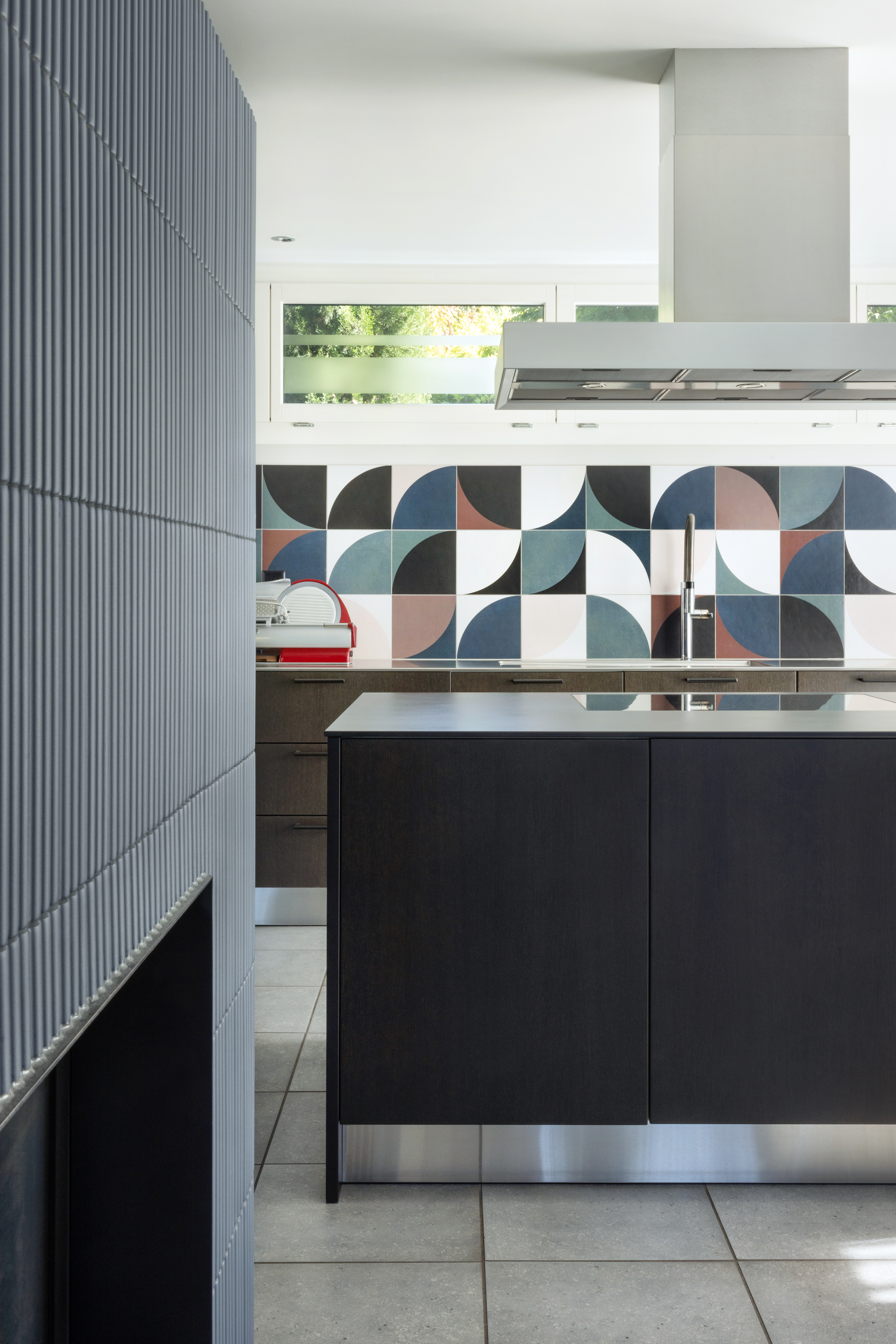 Die Intervention fokussiert stark auf die zu verbauenden Materialien. Für die Fassade werden organische und poröse Farben gewählt, welche sich in die gewachsene Umgebung einbetten. Stoffstoren und ein neuer Bodenbelag aus Klinkersteinen im Fischgrätmuster machen aus der Veranda einen attraktiven Sommerraum. Die Küche wird um ein Wohnzimmermöbel erweitert, das die neue Mitte des Wohngeschosses bildet und die Grosszügigkeit des Raumes stärkt. Der freistehende Kamin erhält ein neues Kleid und gewinnt so an Präsenz. Mit den Fliesen der Küchenrückwand entsteht ein harmonisches Ganzes in neuem Glanz.