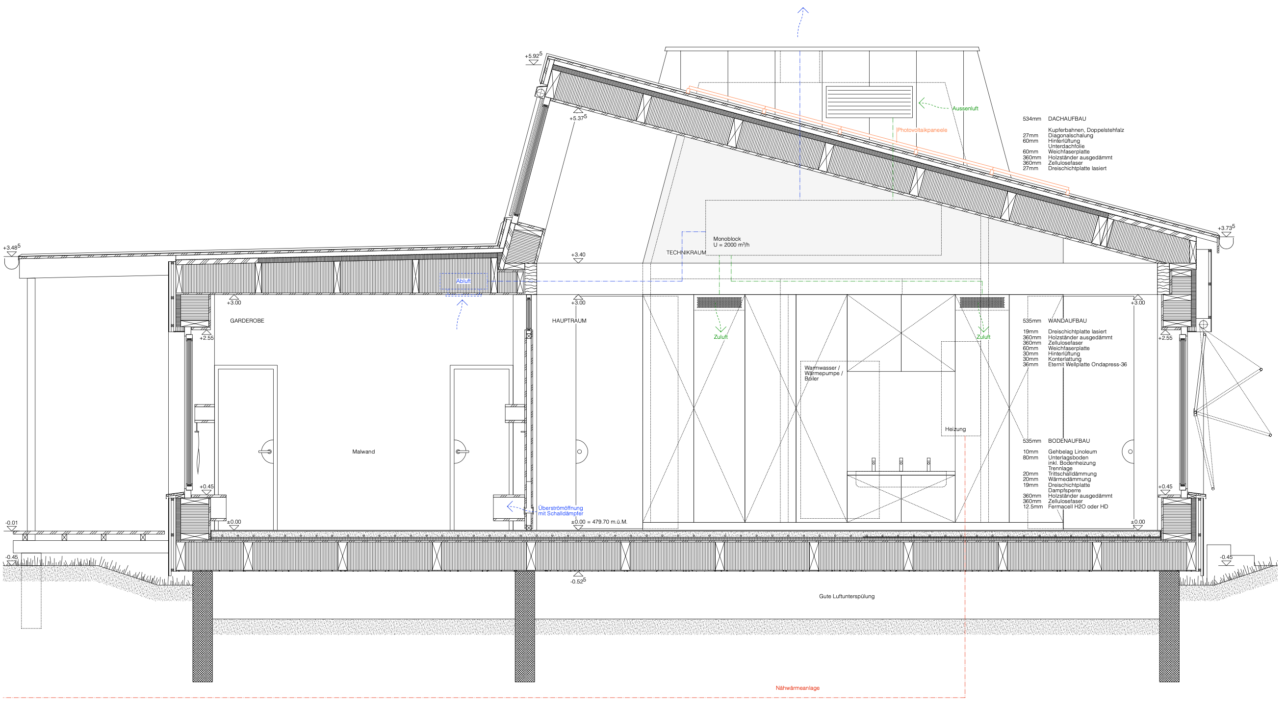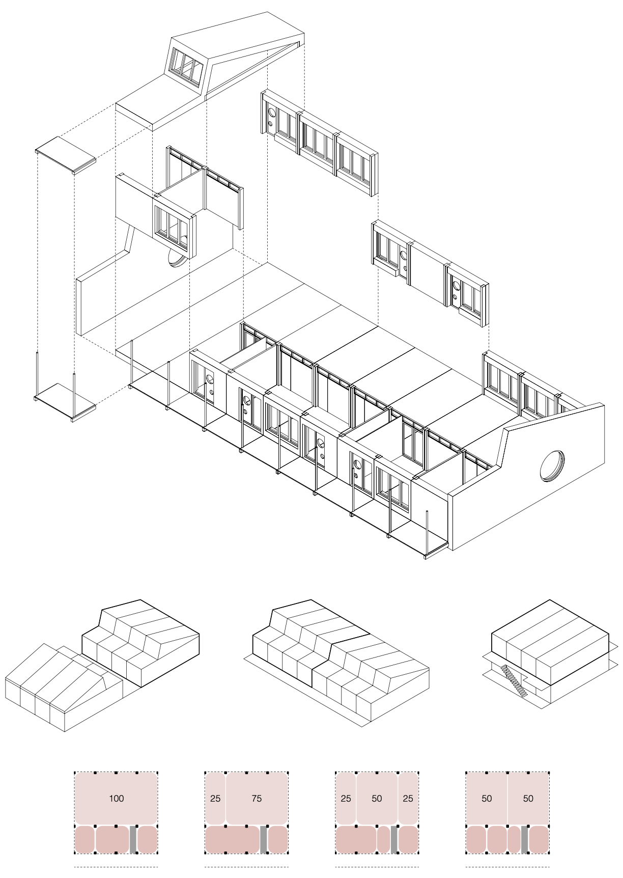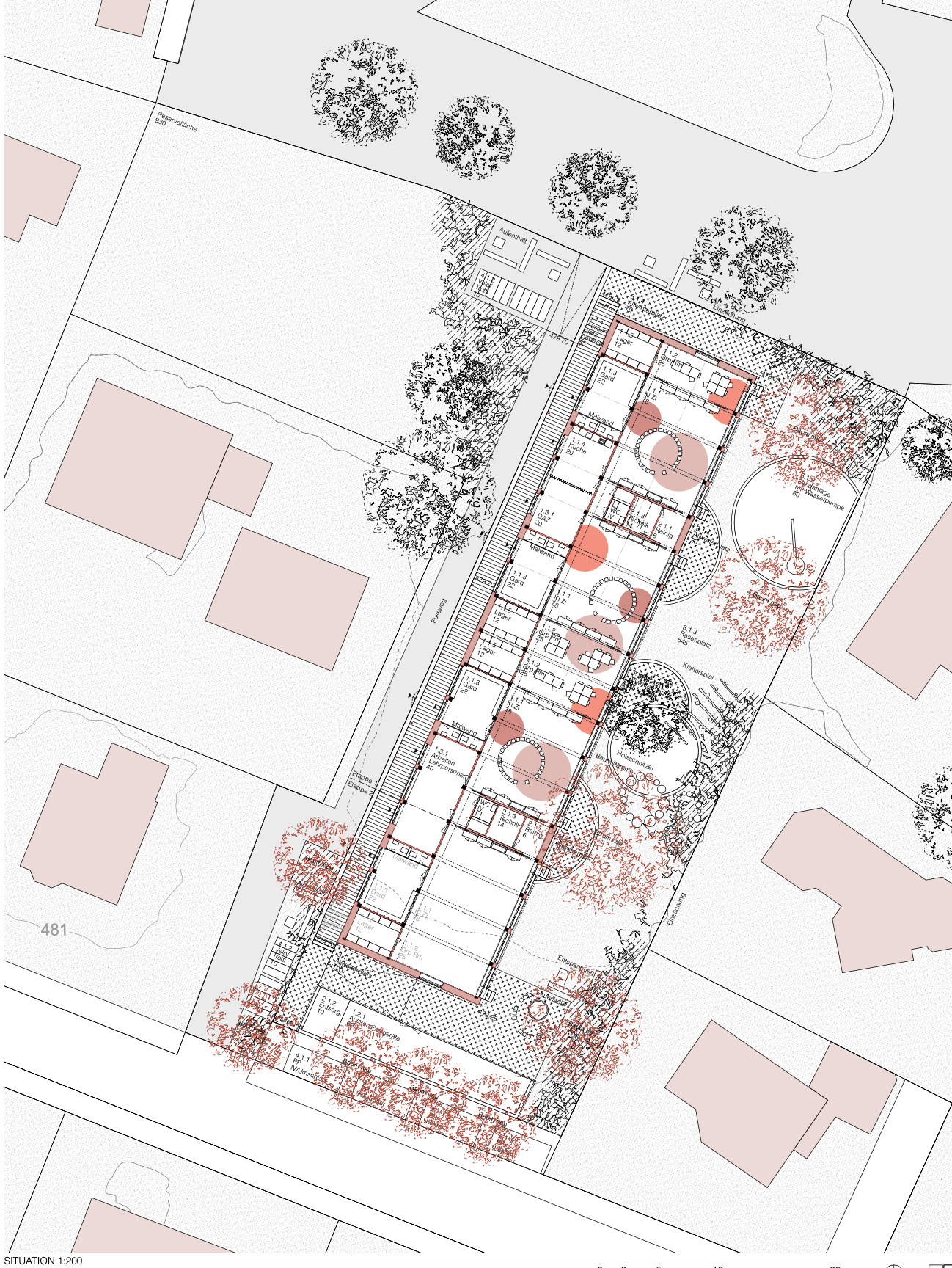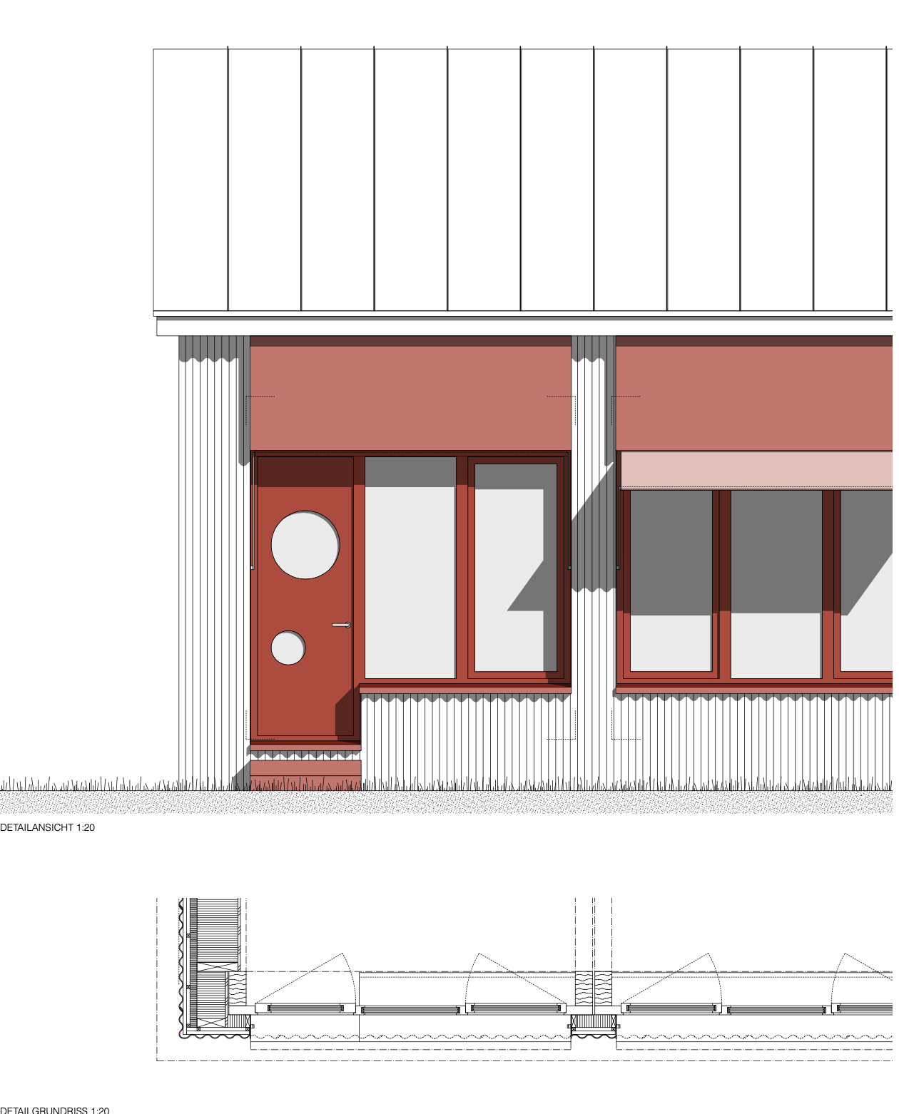 Es wird ein eingeschossiger Bau vorgesehen, welcher durch seine Ebenerdigkeit den starken Bezug zum Aussenraum schafft und somit wörtlich den KinderGARTEN umsetzt. Die einzelnen Kindergärten haben je einen separaten Zugang über eine aussenliegende Verandaschicht. Durch eine zweite Raumschicht, welche die Nebenräume beinhaltet, wird der Hauptraum erreicht. Es werden verschiedene räumliche Qualitäten in einer flexiblen Struktur geschaffen, welche sich nach den Bedürfnissen der Nutzer wandeln können und somit per se nutzungsneutral sind. Die Kindergarteneinheiten sind so konzipiert, dass sie aneinander gereiht (beispielsweise am Standort Kreuzfeld), gespiegelt zu einander stehen (wie am vorliegenden Standort) oder gar gestapelt werden können (für einen mehrgeschossigen Bau in dichterem Kontext).