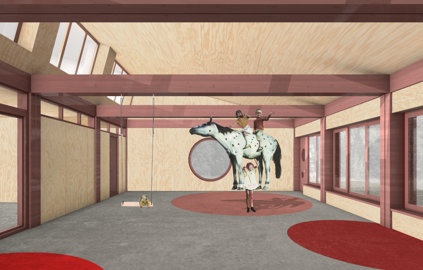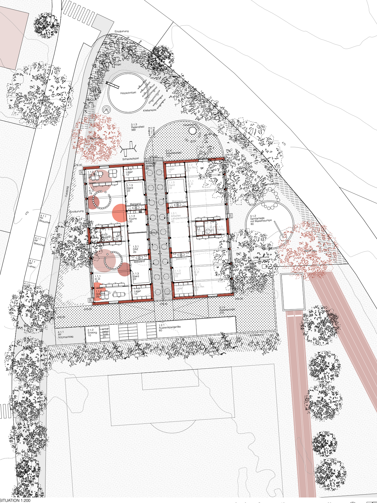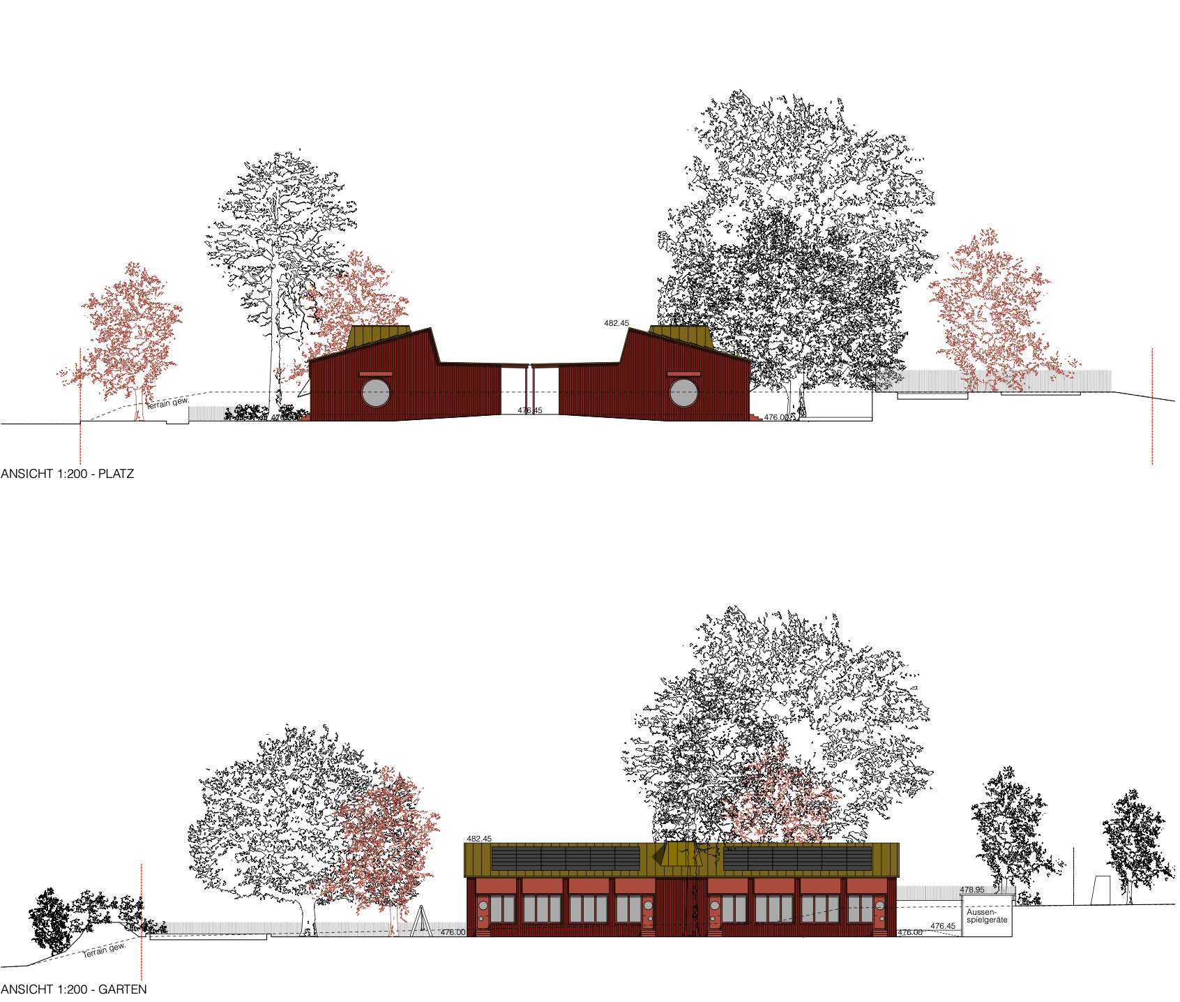 An zwei Standoten sollen Neubauten für einen zweifachen Kindergarten erstellt werden, welche längerfristig um zwei Einheiten erweitert werden sollen. Gesucht wird ein Bauwerk, welches zukünftige Veränderungen in der Nutzung aufnehmen kann. Die Ausgewogenheit der Proportionen, die gewählte statische Struktur des freien Grundrisses sowie die Modularität der Konstruktion lassen Transformation und Wachstum zu.