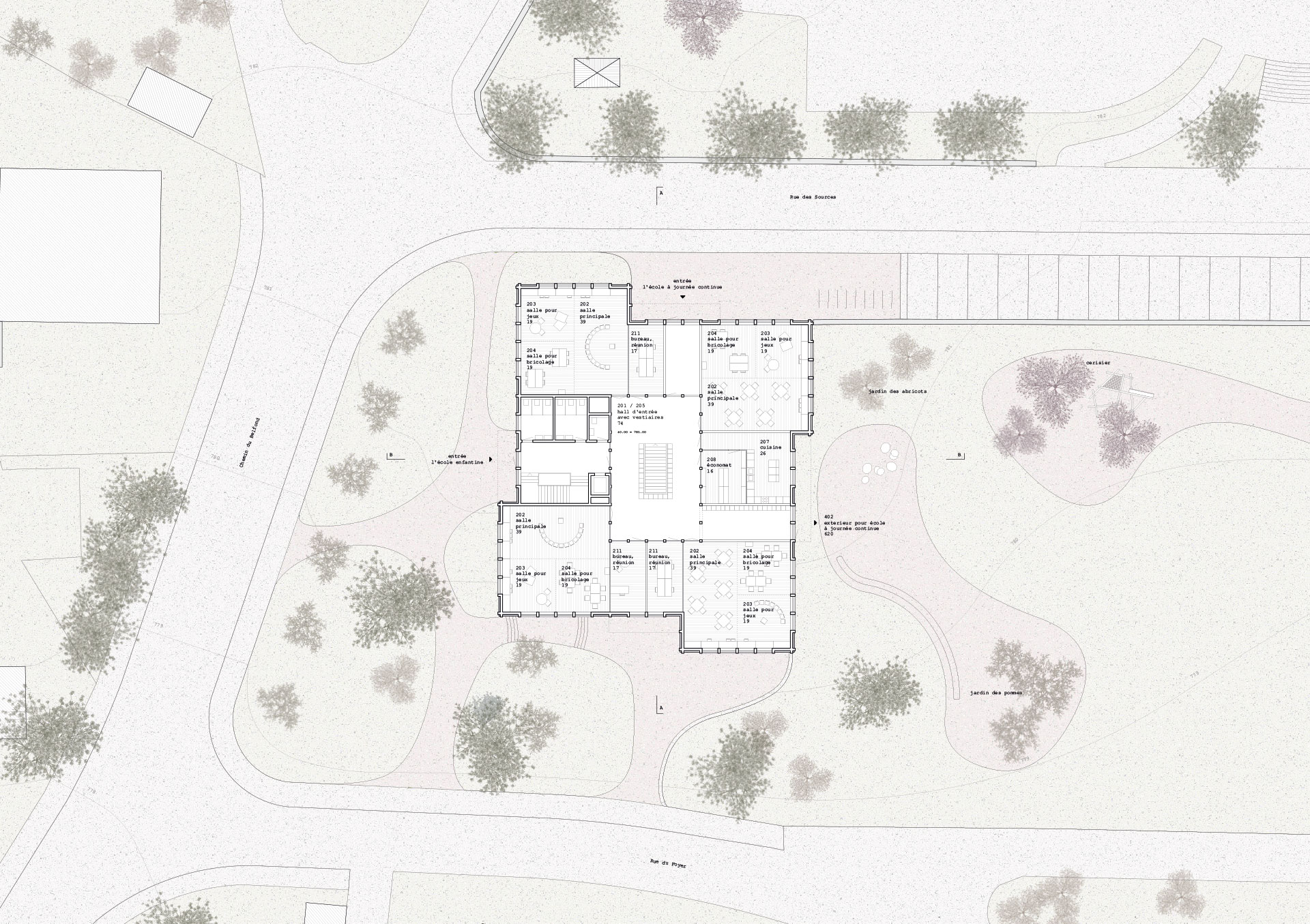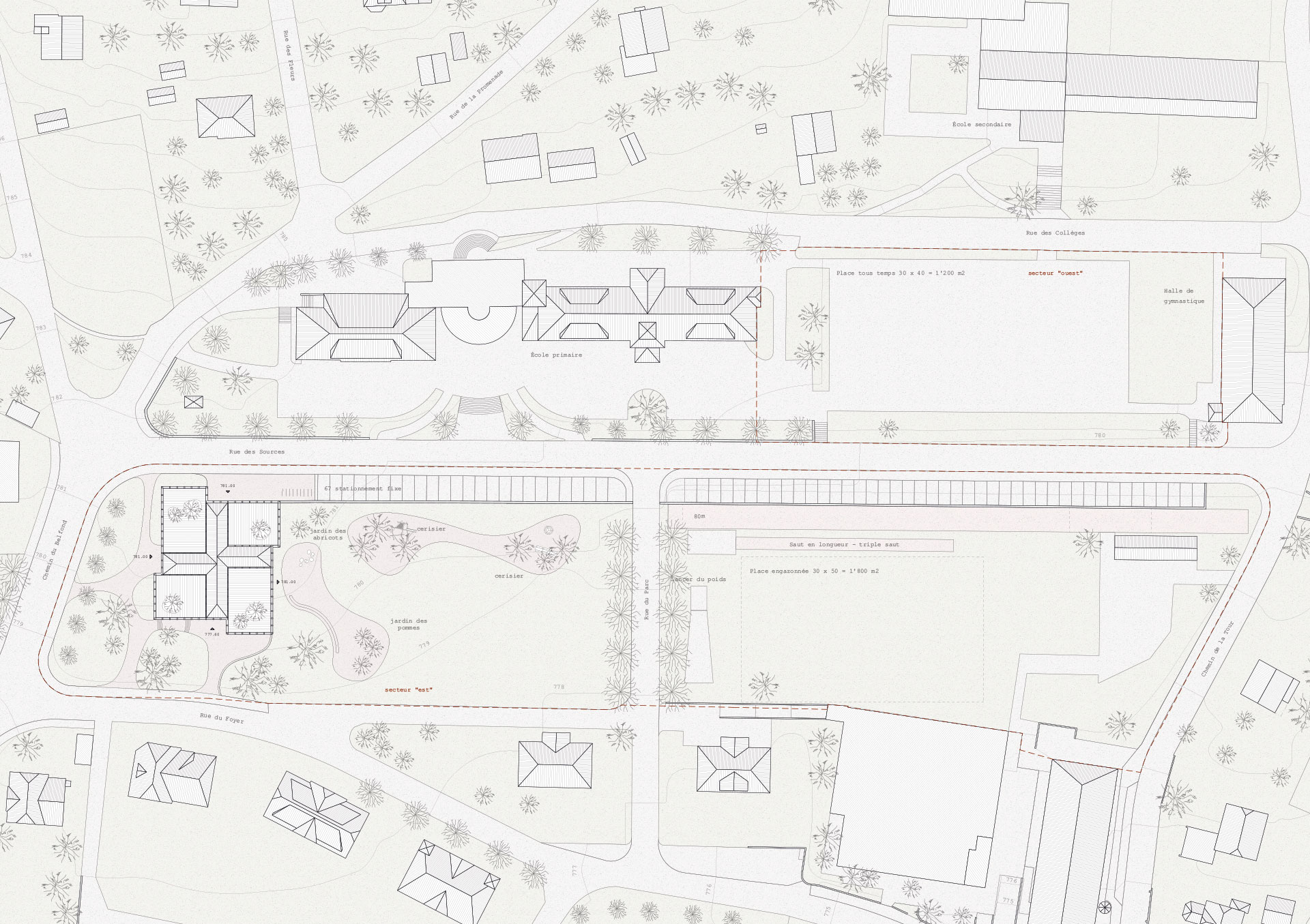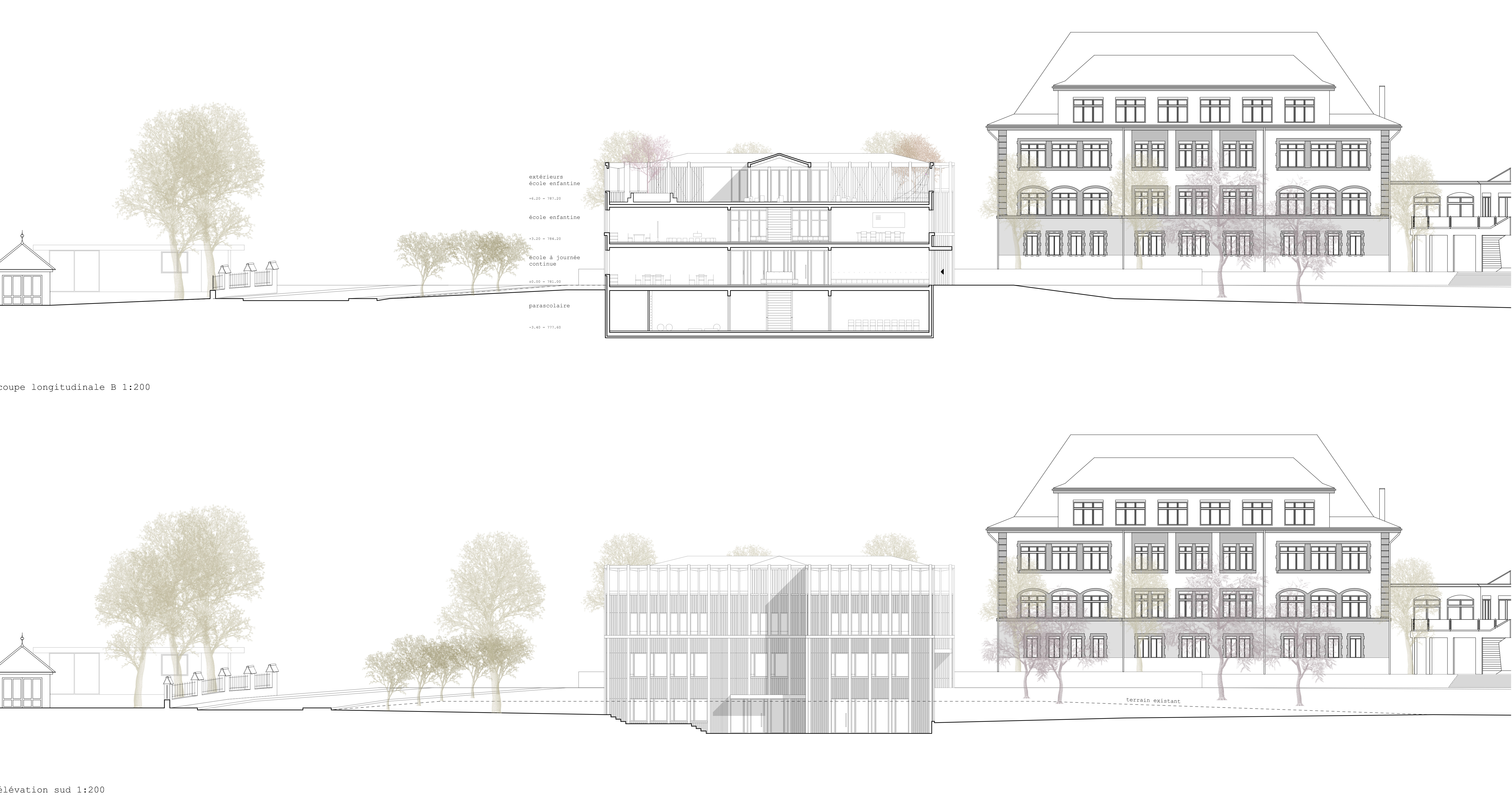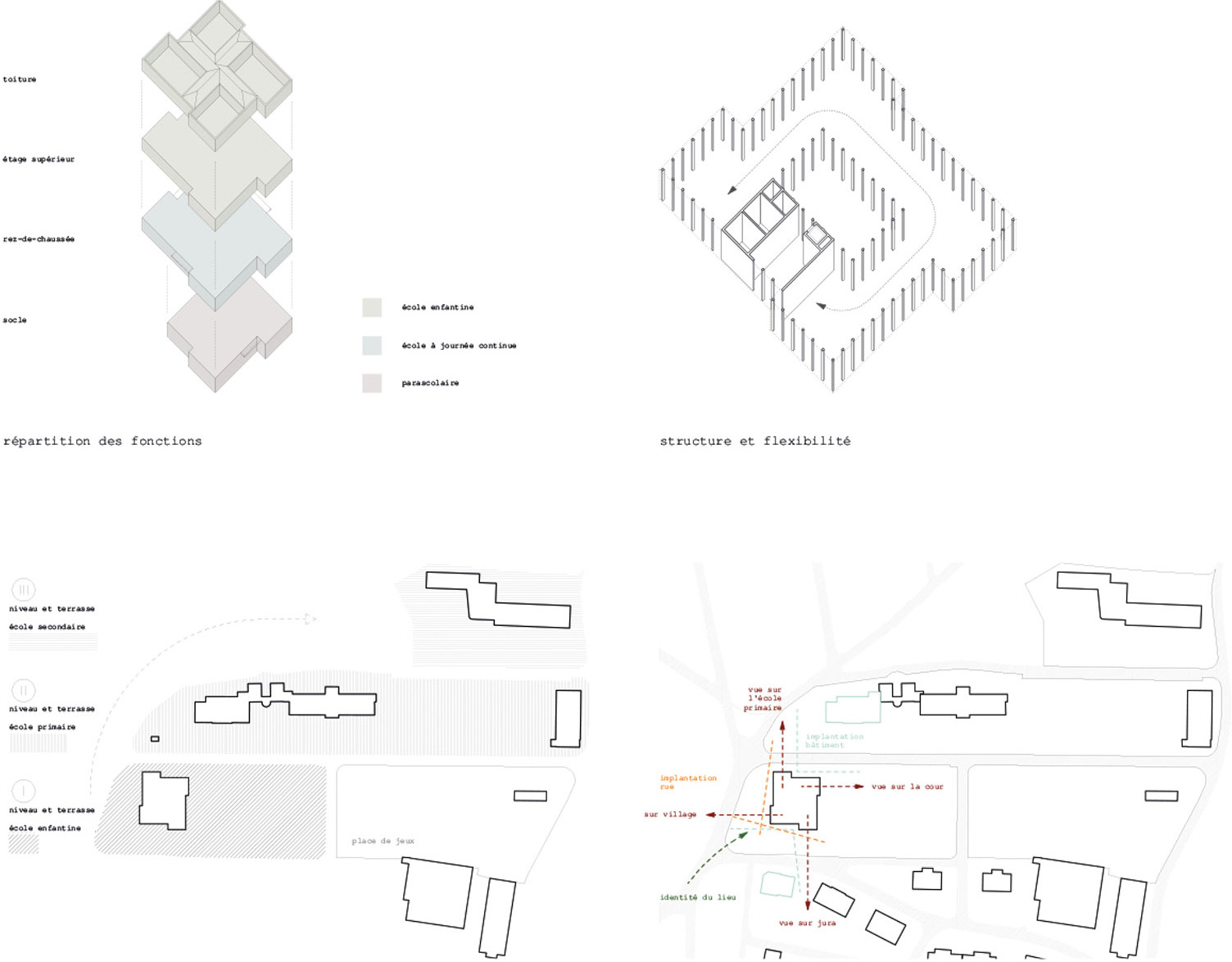 Zu dieser Zeit wurden die Gebäude am Dorfrand erbaut, was die Grundlage für den bis heute sehr grosszügigen Aussenraum bildet. Der Neubau für den Cycle Elementaire versucht die Lücke zu schliessen und das Schulareal und dessen Qualitäten zu stärken. Auf der untersten Ebene des terrassierten Gesamtareals wird ein Volumen gesetzt, das in seiner Körnung einen Beitrag zum Gesamtareal leisten kann. Es bildet eine neue Adresse vom Dorf her kommend, will aber gleichzeitig die Hauptbauten nicht konkurrenzieren.