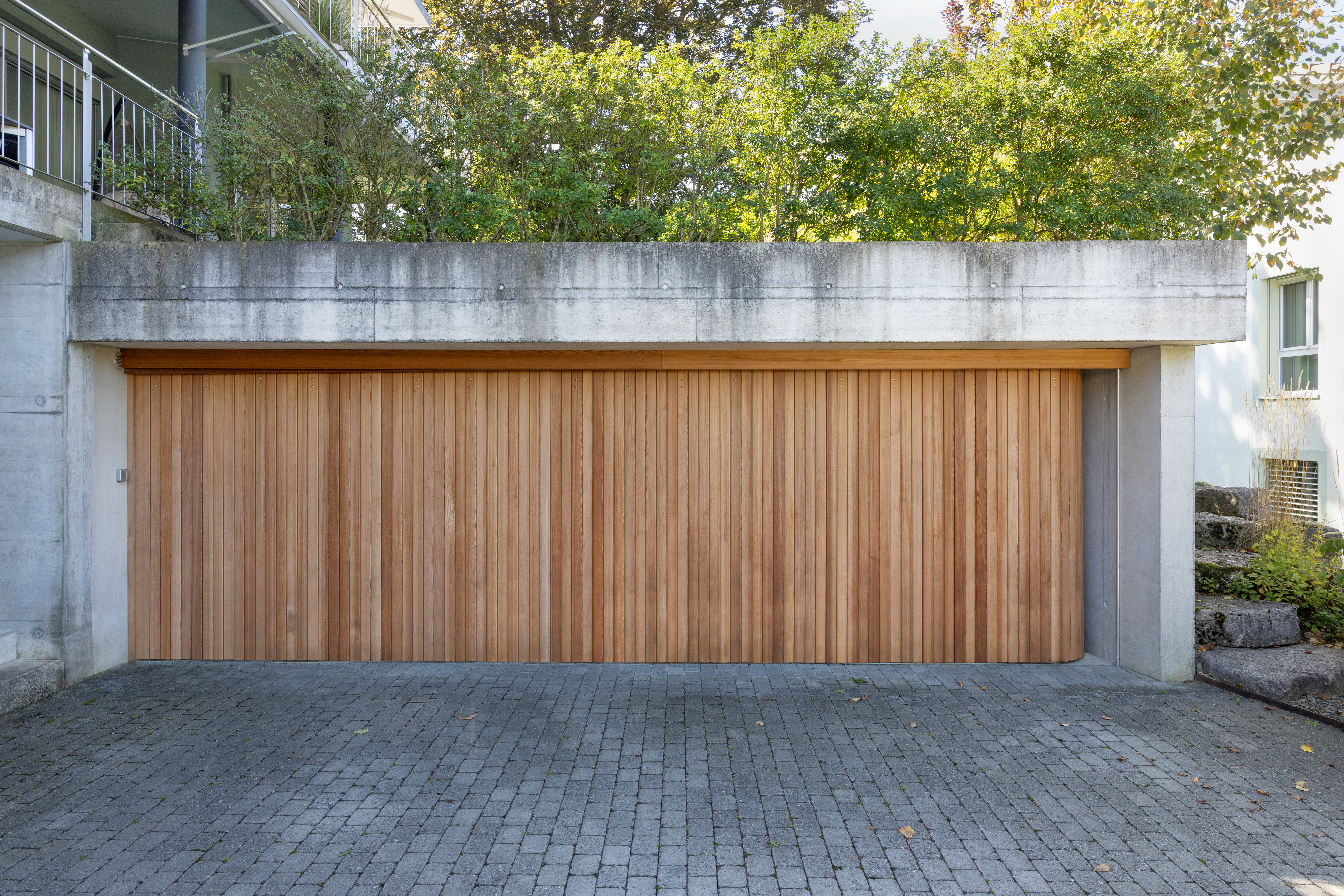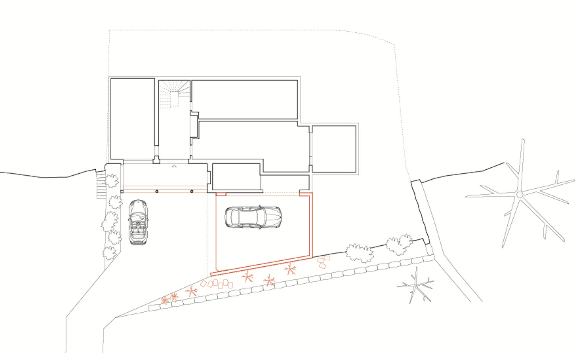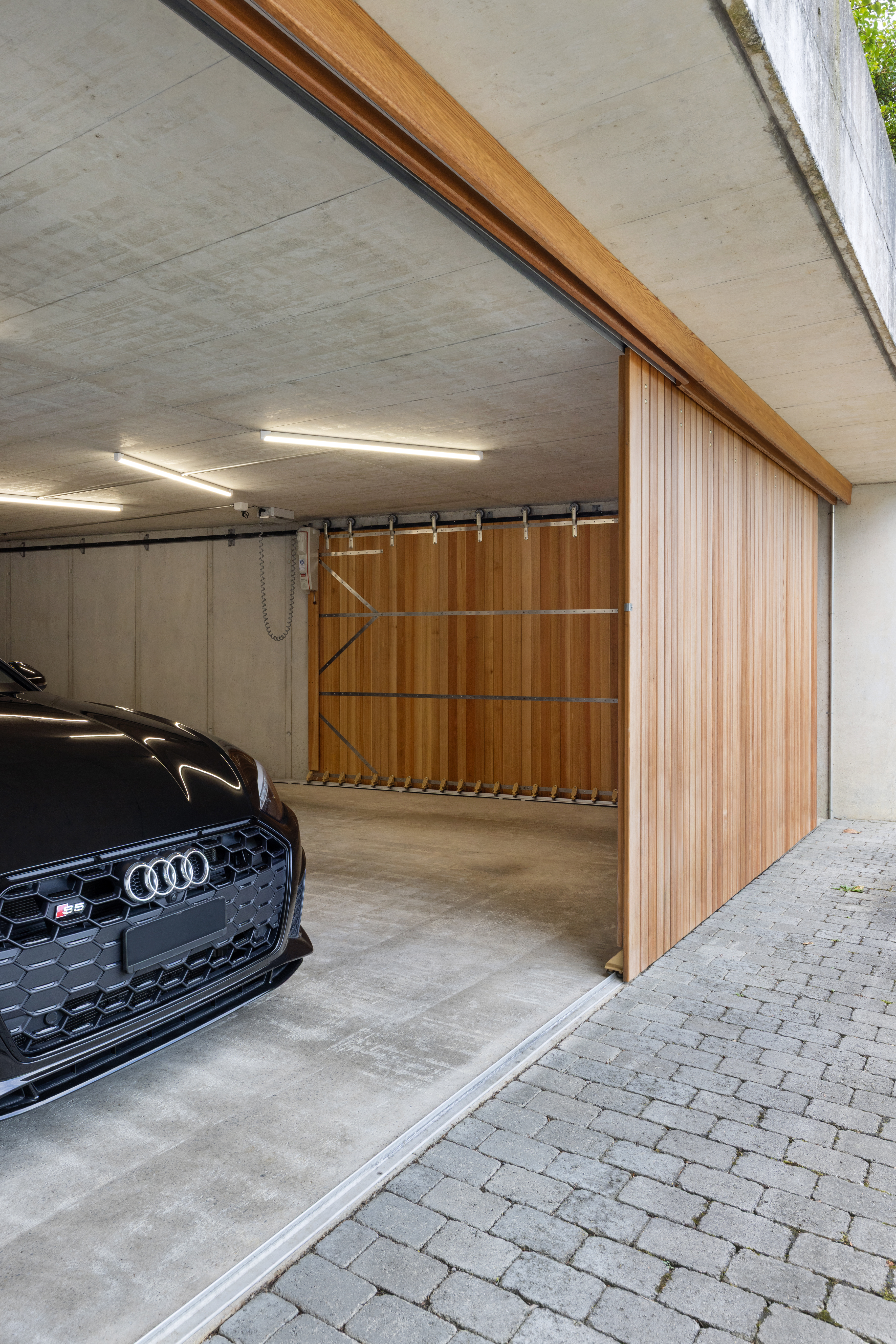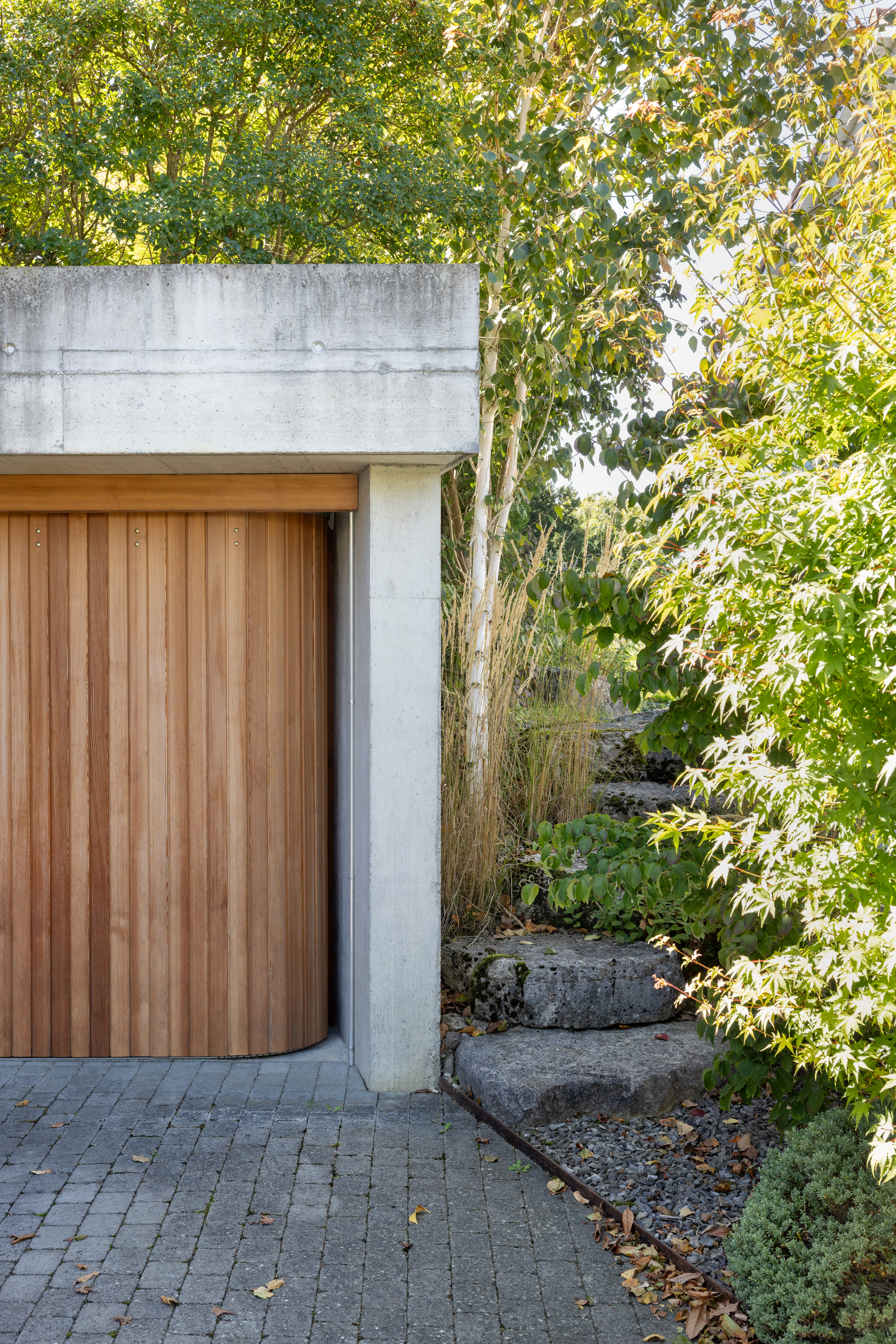 Der Anbau kann durch die Absenkung des Vorplatzes bestmöglich zum Bestand platziert werden. Die Höhenkoten der bestehenden Betondecke werden mit dem Betonkranz des Garagendaches weitergeführt und erscheinen so als selbstverständlich und gewachsen. Damit wird ein neuer Auftritt des Eingangs geschaffen, dieser ist nun über zwei lange Tritte erreichbar. Die Gartenebene erhält eine neue Klarheit, Gartenstufen gliedern die Umgebung in differenzierte Ebenen und stärken den Ausblick zum See. Das hölzerne Garagentor rollt sich wie ein Vorhang zur Seite und macht aus dem Garagenbau ein eingebettetes Gartenelement.