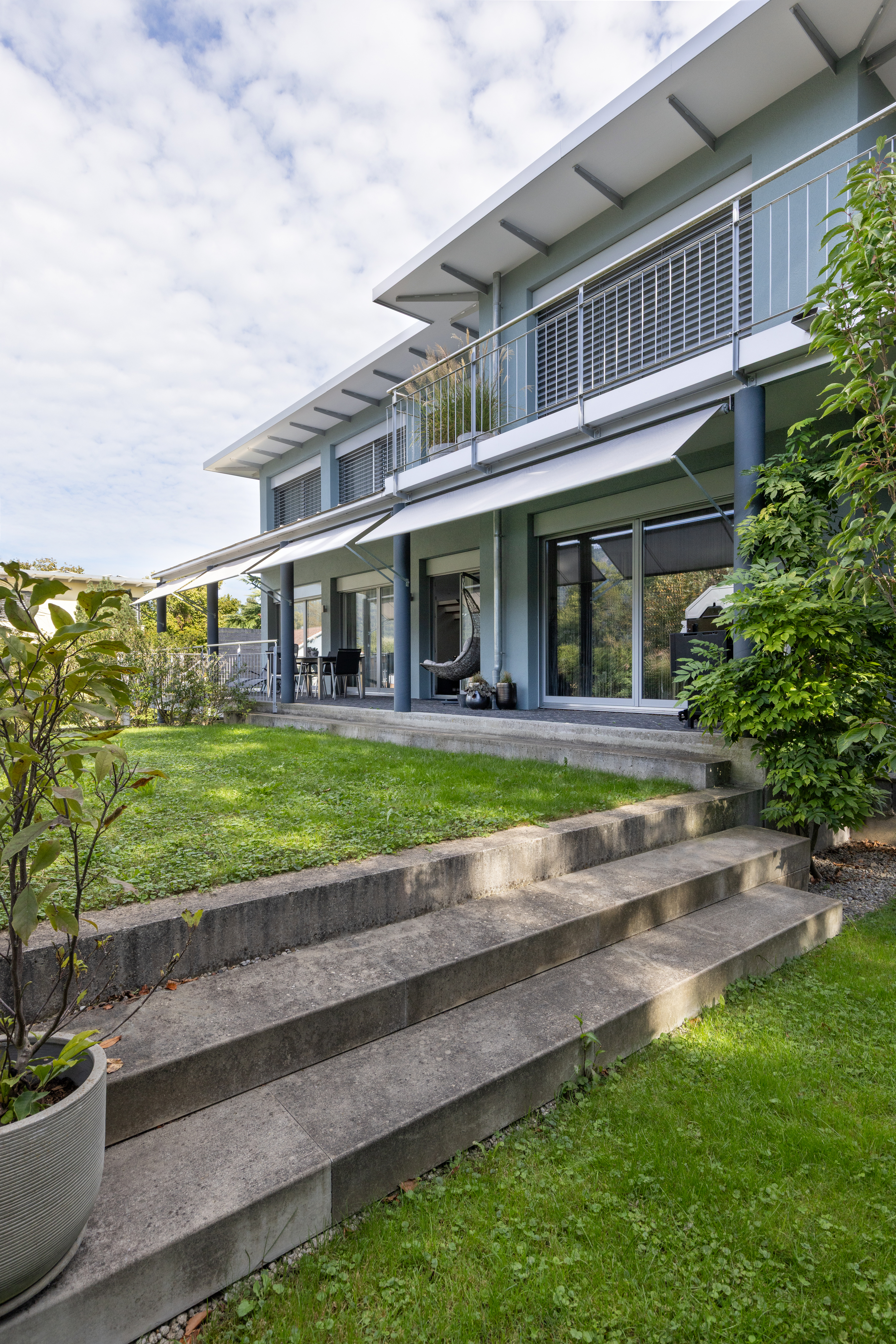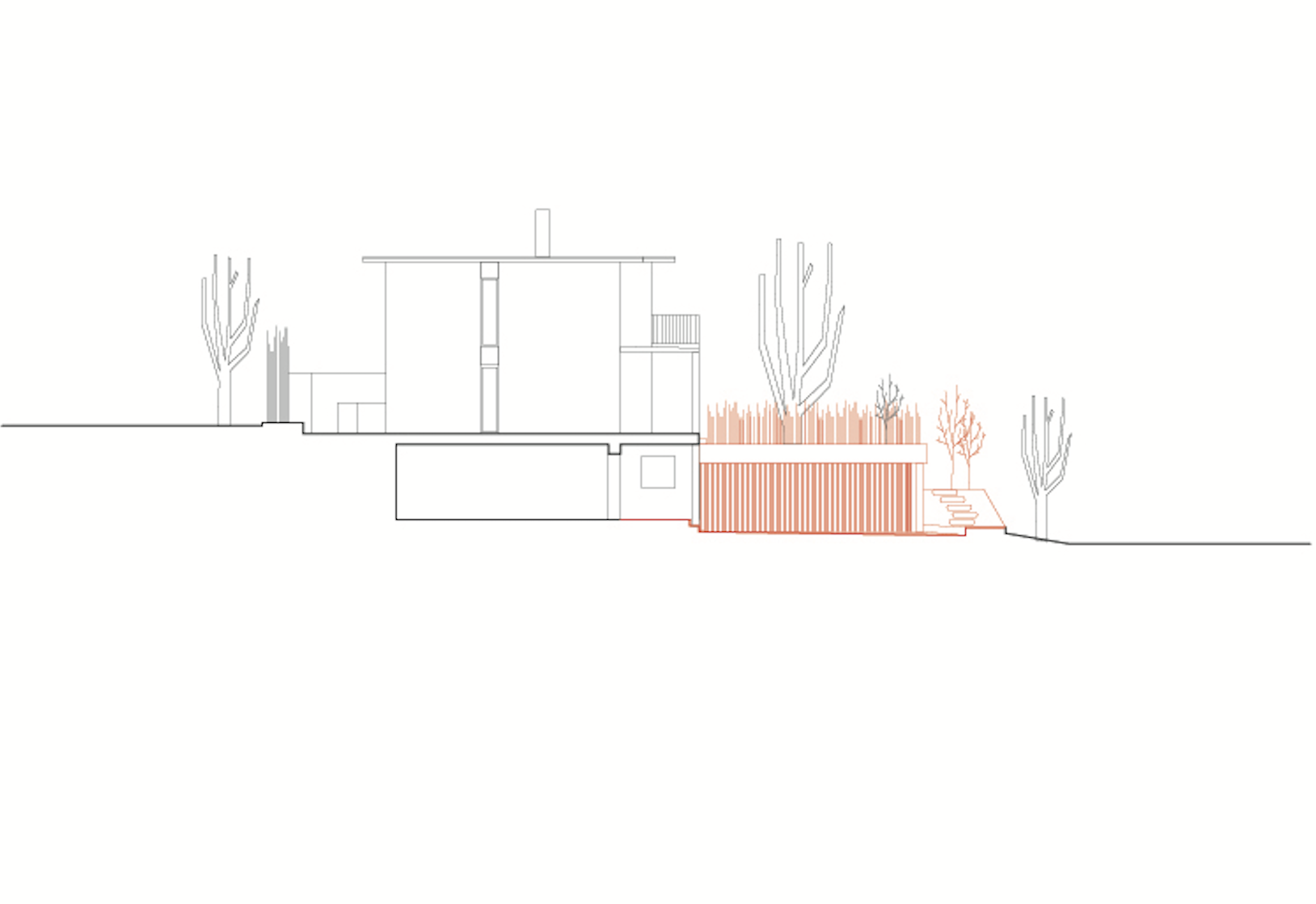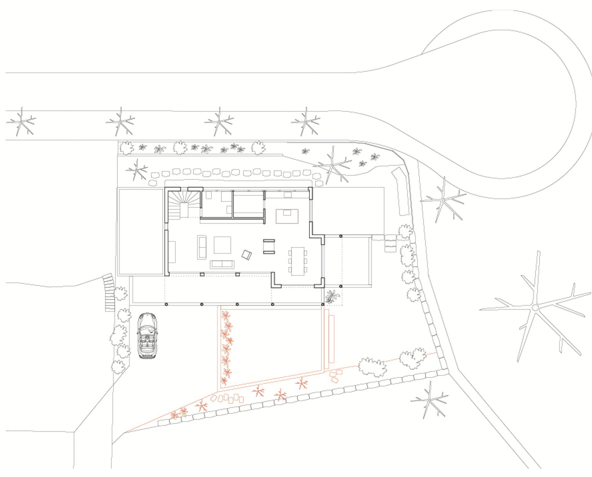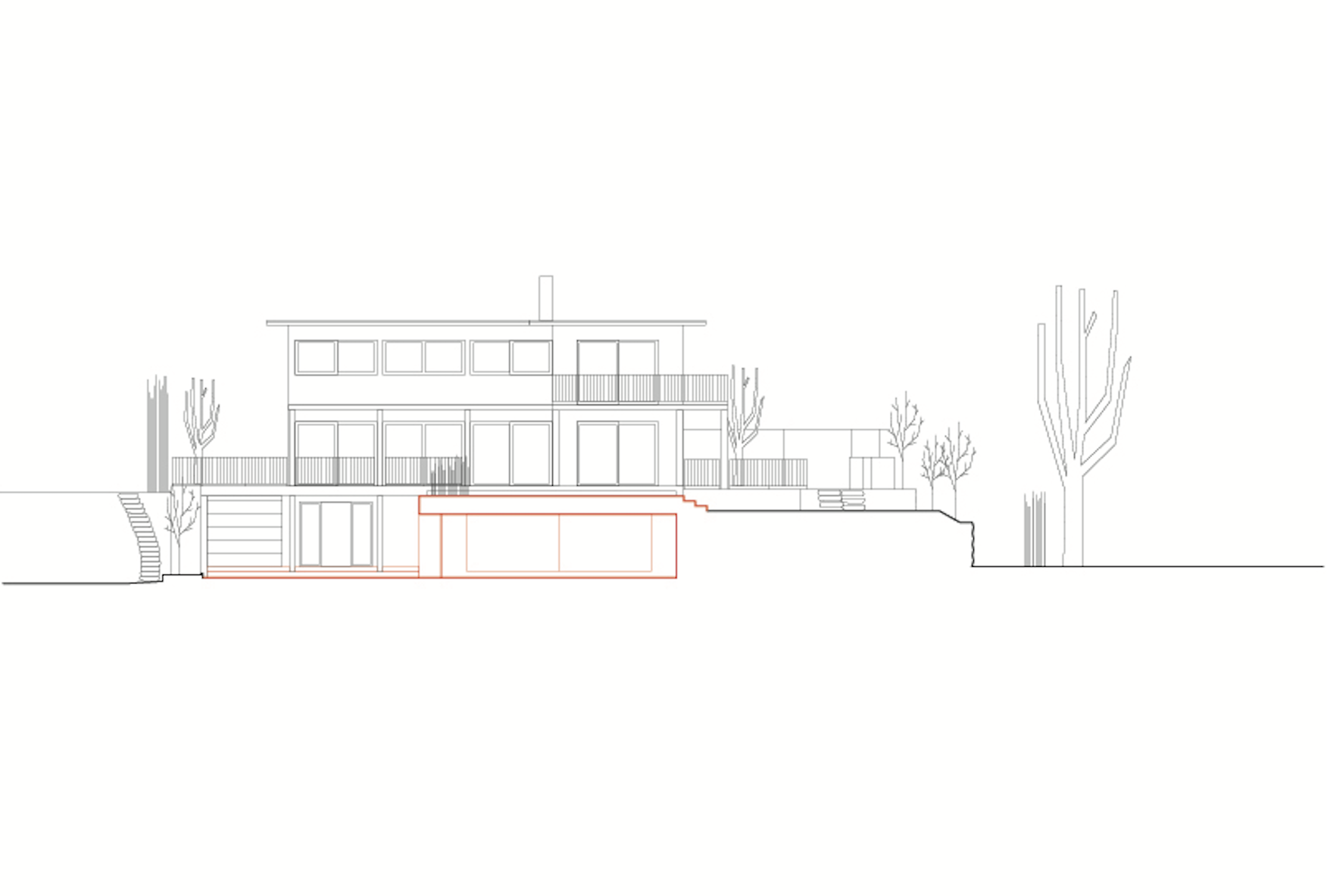 Der Anbau kann durch die Absenkung des Vorplatzes bestmöglich zum Bestand platziert werden. Die Höhenkoten der bestehenden Betondecke werden mit dem Betonkranz des Garagendaches weitergeführt und erscheinen so als selbstverständlich und gewachsen. Damit wird ein neuer Auftritt des Eingangs geschaffen, dieser ist nun über zwei lange Tritte erreichbar. Die Gartenebene erhält eine neue Klarheit, Gartenstufen gliedern die Umgebung in differenzierte Ebenen und stärken den Ausblick zum See. Das hölzerne Garagentor rollt sich wie ein Vorhang zur Seite und macht aus dem Garagenbau ein eingebettetes Gartenelement.