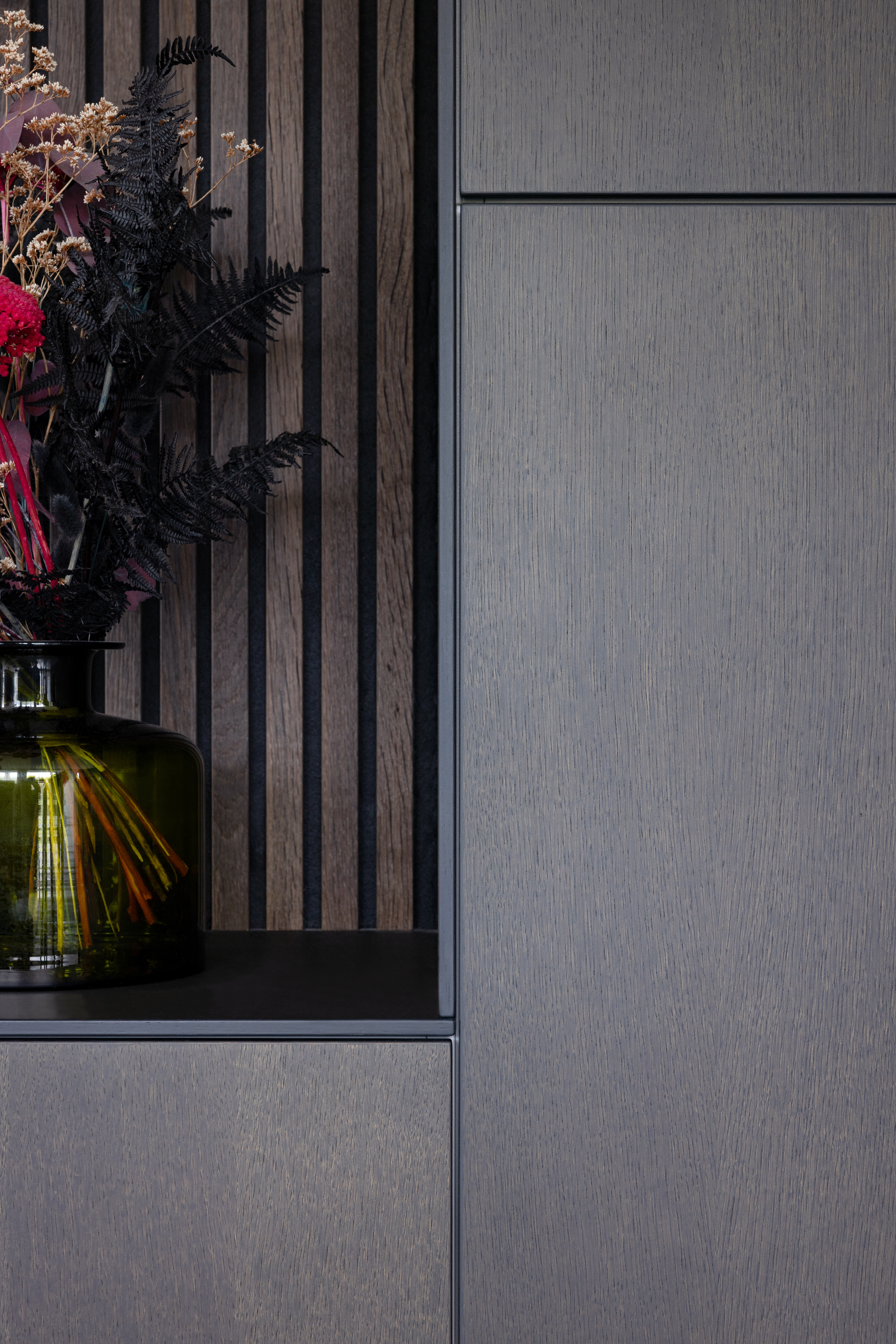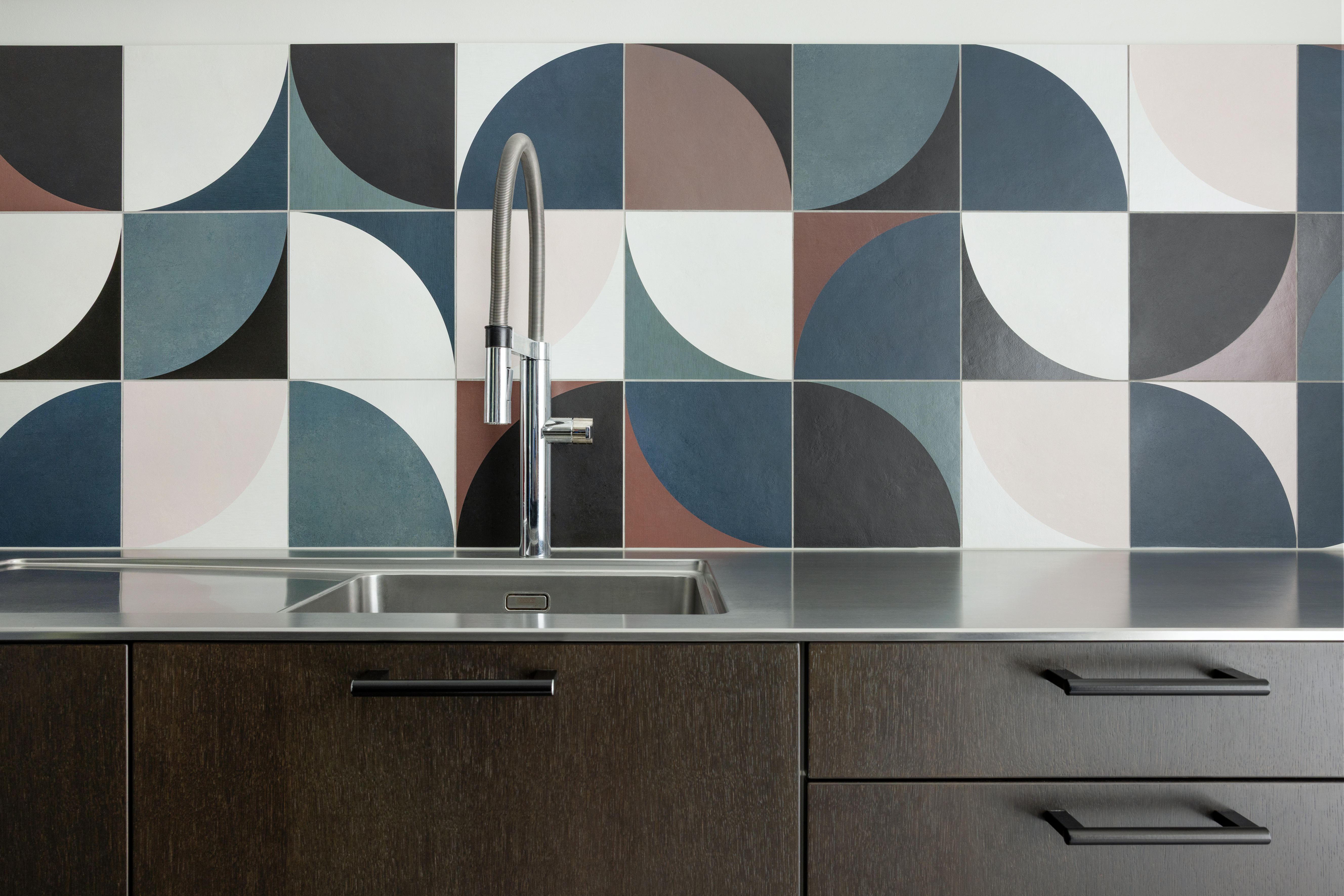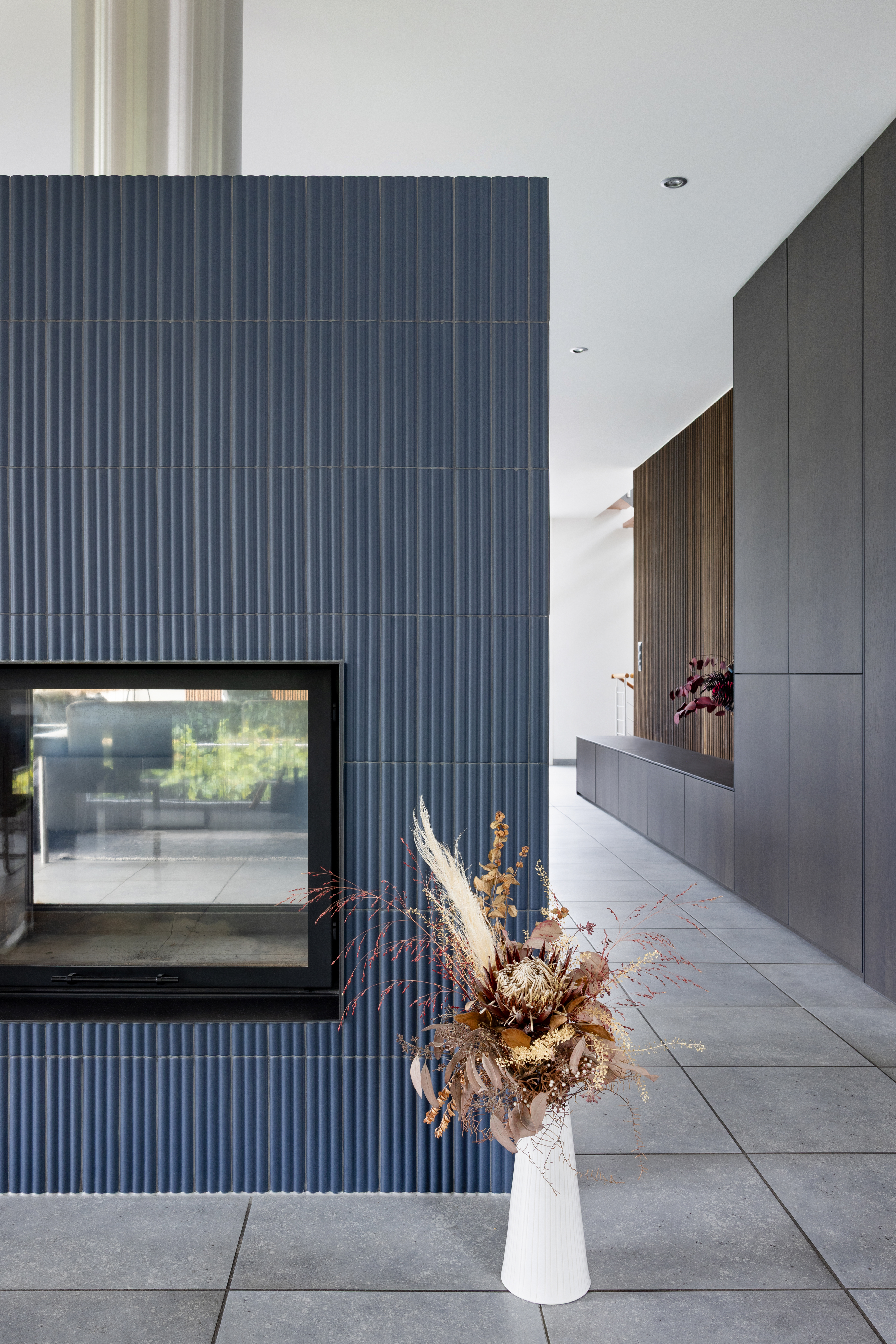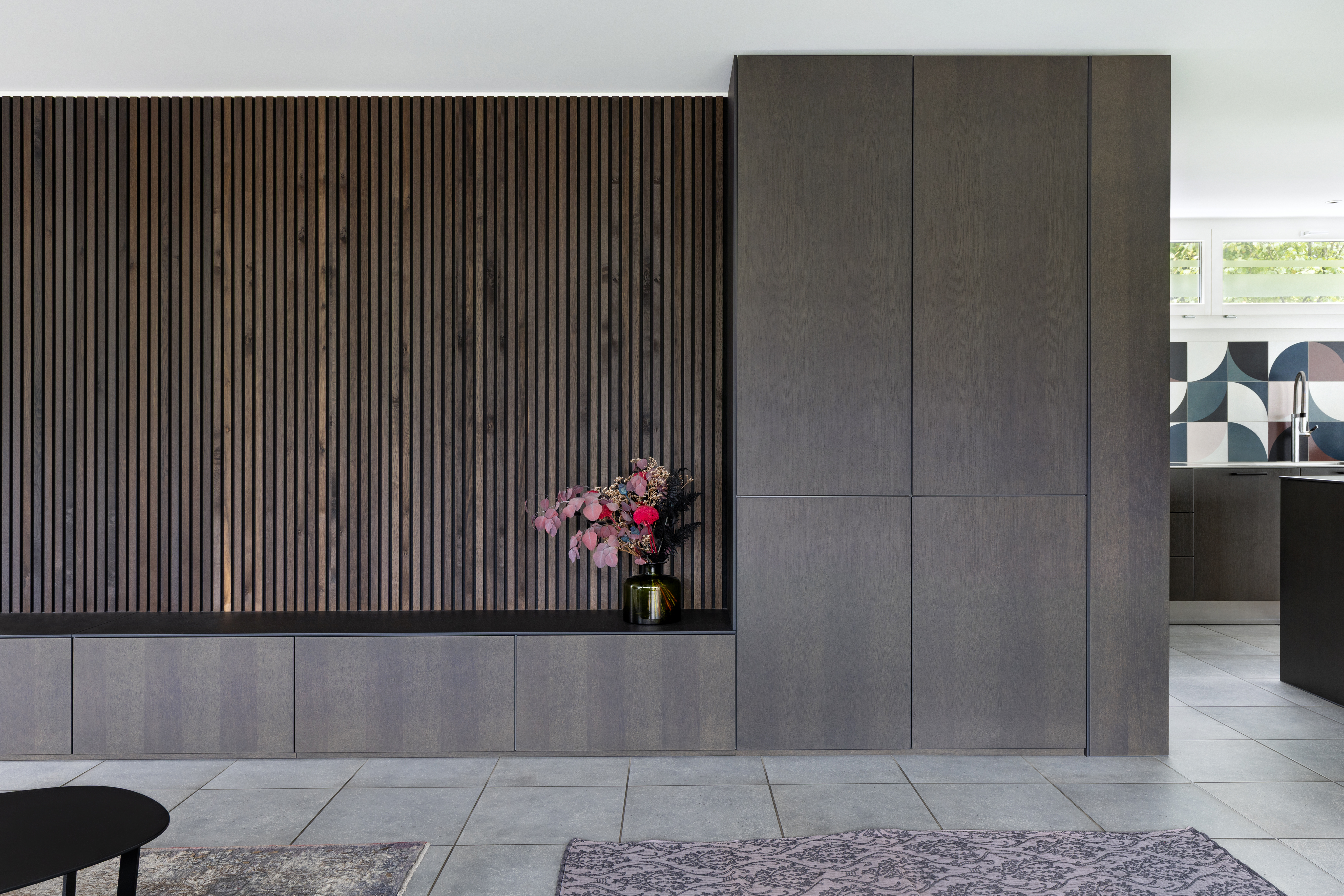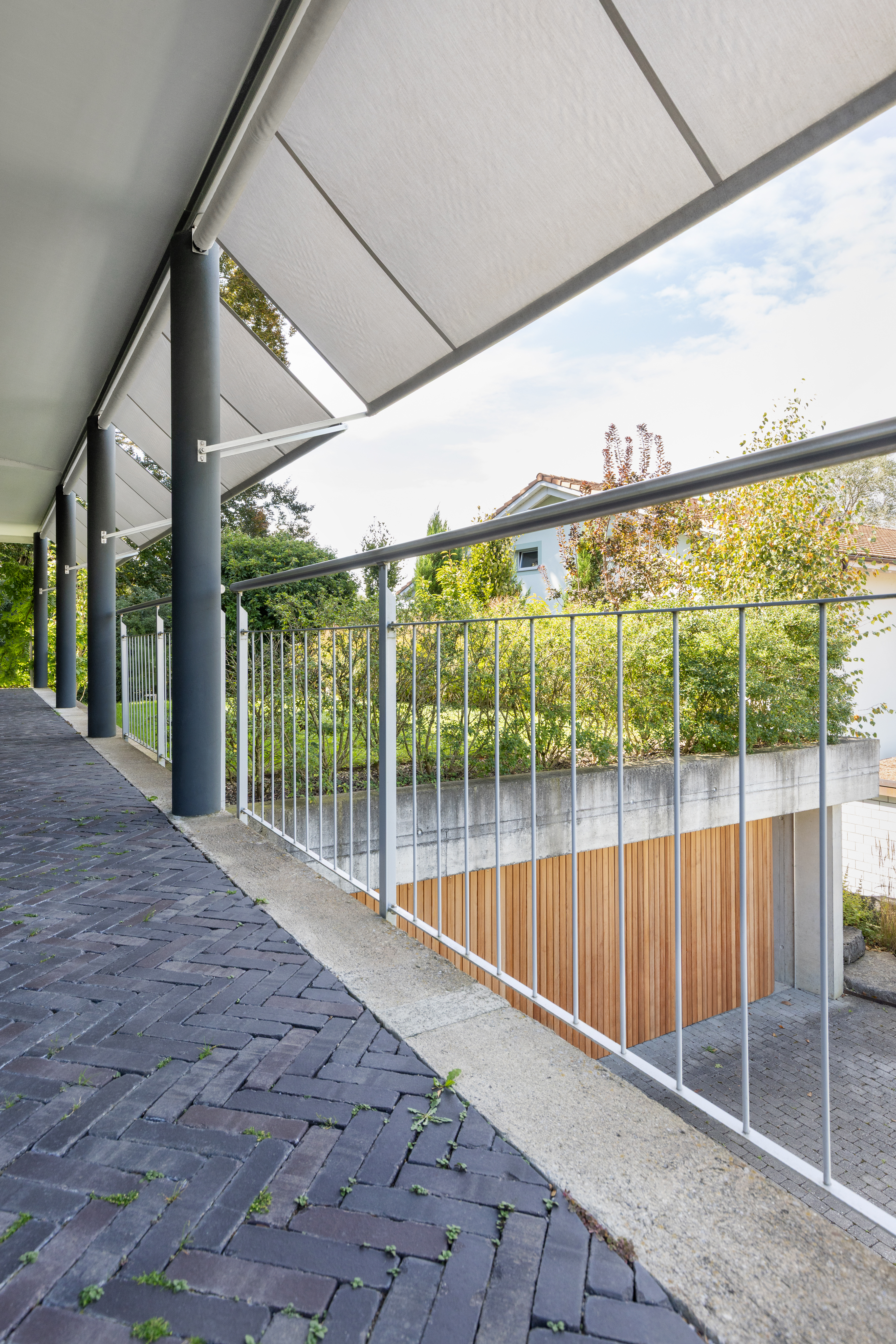 Die Intervention fokussiert stark auf die zu verbauenden Materialien. Für die Fassade werden organische und poröse Farben gewählt, welche sich in die gewachsene Umgebung einbetten. Stoffstoren und ein neuer Bodenbelag aus Klinkersteinen im Fischgrätmuster machen aus der Veranda einen attraktiven Sommerraum. Die Küche wird um ein Wohnzimmermöbel erweitert, das die neue Mitte des Wohngeschosses bildet und die Grosszügigkeit des Raumes stärkt. Der freistehende Kamin erhält ein neues Kleid und gewinnt so an Präsenz. Mit den Fliesen der Küchenrückwand entsteht ein harmonisches Ganzes in neuem Glanz.