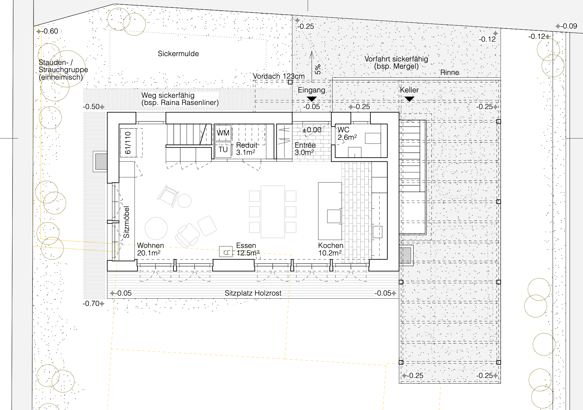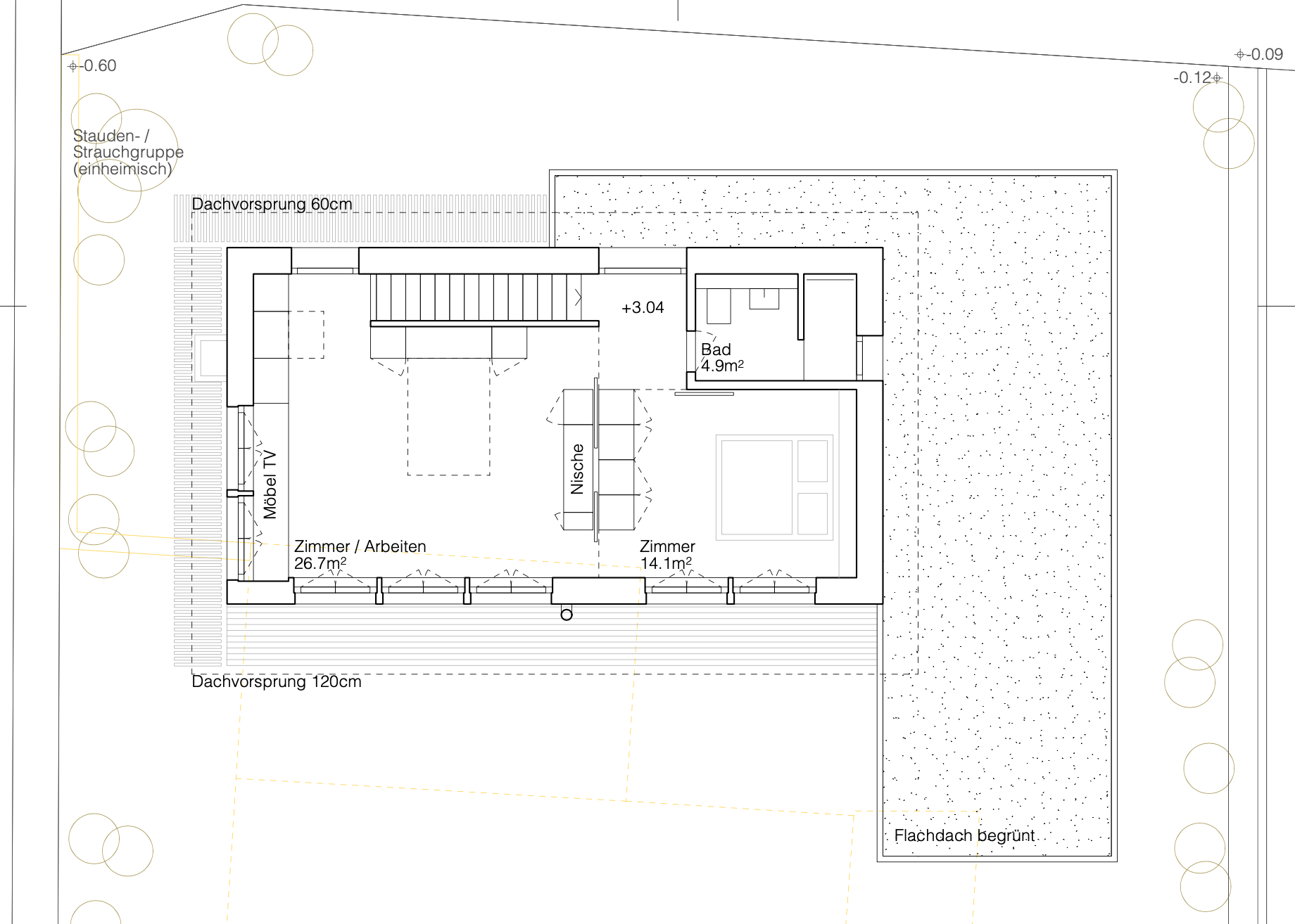 Jede Lebenslage stellt neue Anforderungen an das Leben und das Wohnen. In Meiringen will man sich verkleinern: Ein Haus für Zwei, mit Möglichkeit zur Beherberbung weiterer Familienmitglieder. Das Haus in Meiringen bettet sich ein in eine durchmischte Umgebung: Ein grossmassstäbliches Industriegebäude zum einen und eine gewachsene, dörfliche Struktur zum anderen. Die Lagequalität ergibt sich inbesondere durch den Weitblick in die Natur und die Berge.