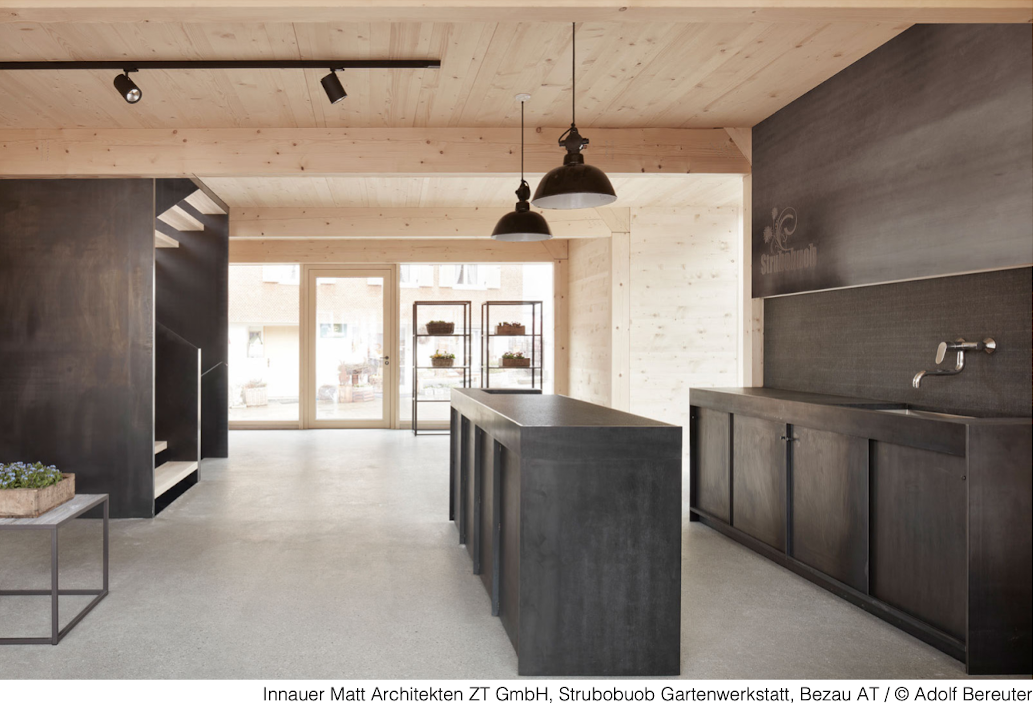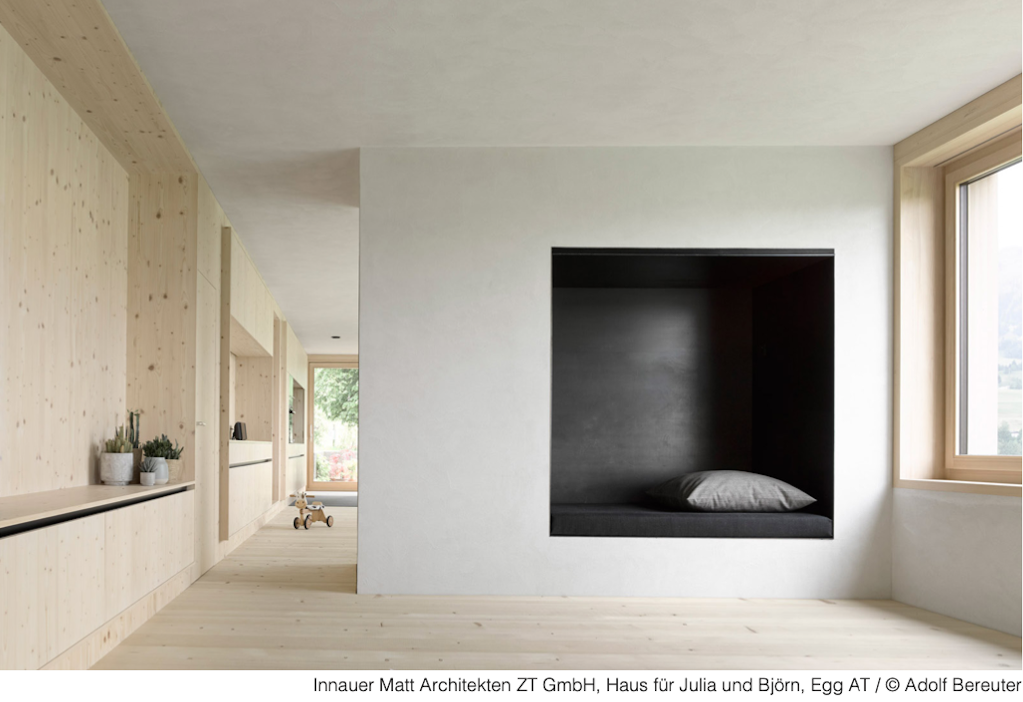 Im Innern ist das Haus klar und effizient und schafft es mit einigen räumlichen Details, die Schönheit der Einfachheit zu zelebrieren. Das Haus sucht seinen Charakter im Charme der Materialien: Diese sollen robust und langlebig sein. Der Holzbau stellt hierfür eine passende Lösung dar. Auch in der äusseren Erscheinung bleibt das Haus schlank und bettet sich mit seiner rhythmisch leichten Fassade gut in die Umgebung ein. Im Inneren schafft das Material Behaglichkeit und Wärme.