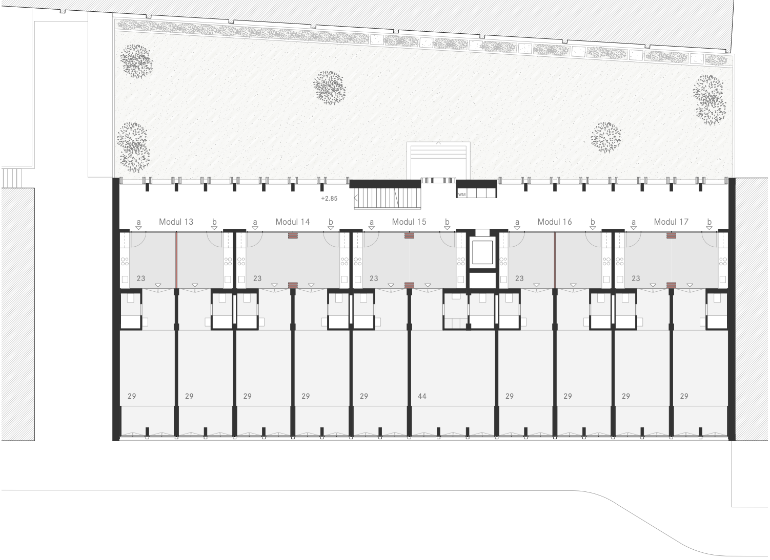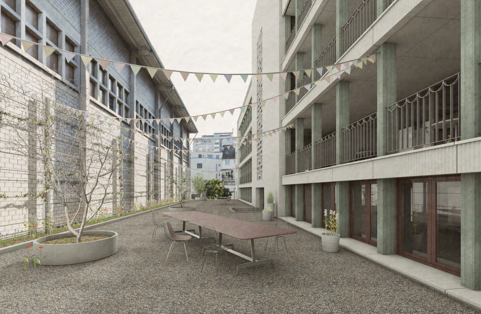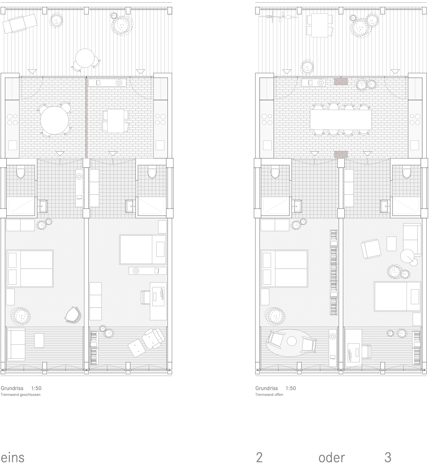 Eine präzise Erschliessungsfigur gliedert die unterschiedlichen Nutzungen im Haus und schafft verschiedene Privatheitsgrade: Ein prägnanter Treppenaufgang führt in die grosszügige Eingangshalle, welche sämtliche Nutzungen erschliesst und eine Querverbindung vom Strassenraum in den hofseitigen Aussenraum schafft. Der Hof ist das extrovertierte Zentrum und ermöglicht für Begegnungen. Die Laubengänge, welche die Wohnungen erschliessen, werden durch die Bewohner in Beschlag genommen und dienen als privater Aussenraum. Die Essküchen teilen sich jeweils zwei Kleinwohnungen. Die Kleinwohnung selbst ist schliesslich der individuelle private Rückzugsort des Einzelnen. Die Grundrisstypologie ist durch flexible Trennwände modular aufgebaut: Eins 2 oder 3 und ermöglicht damit verschiedene Nutzungsszenarien.