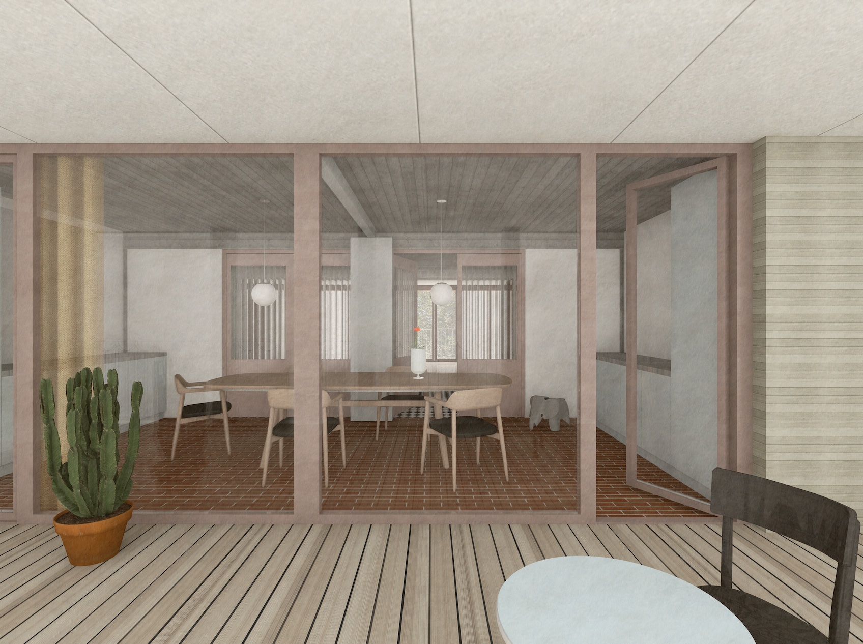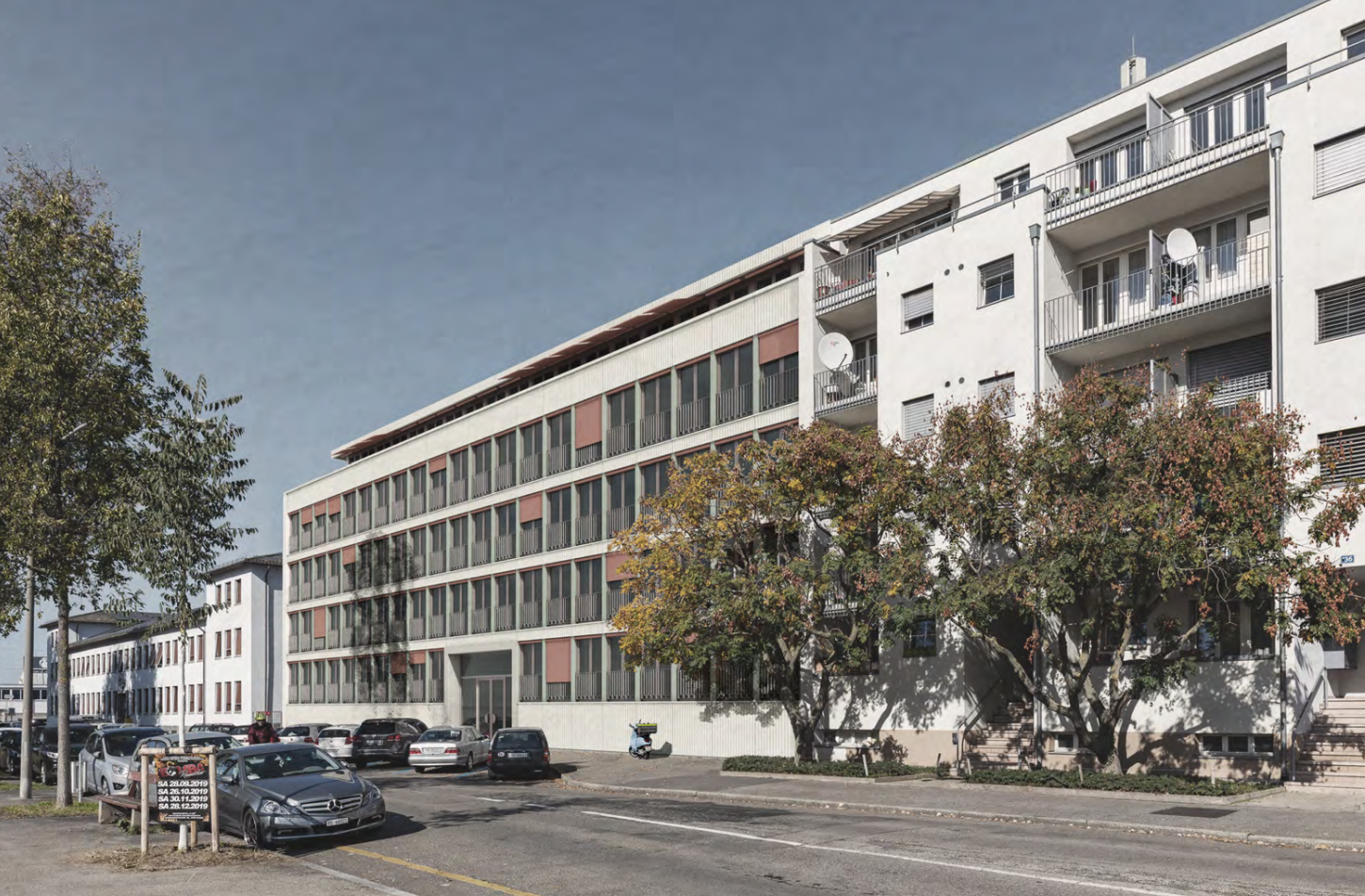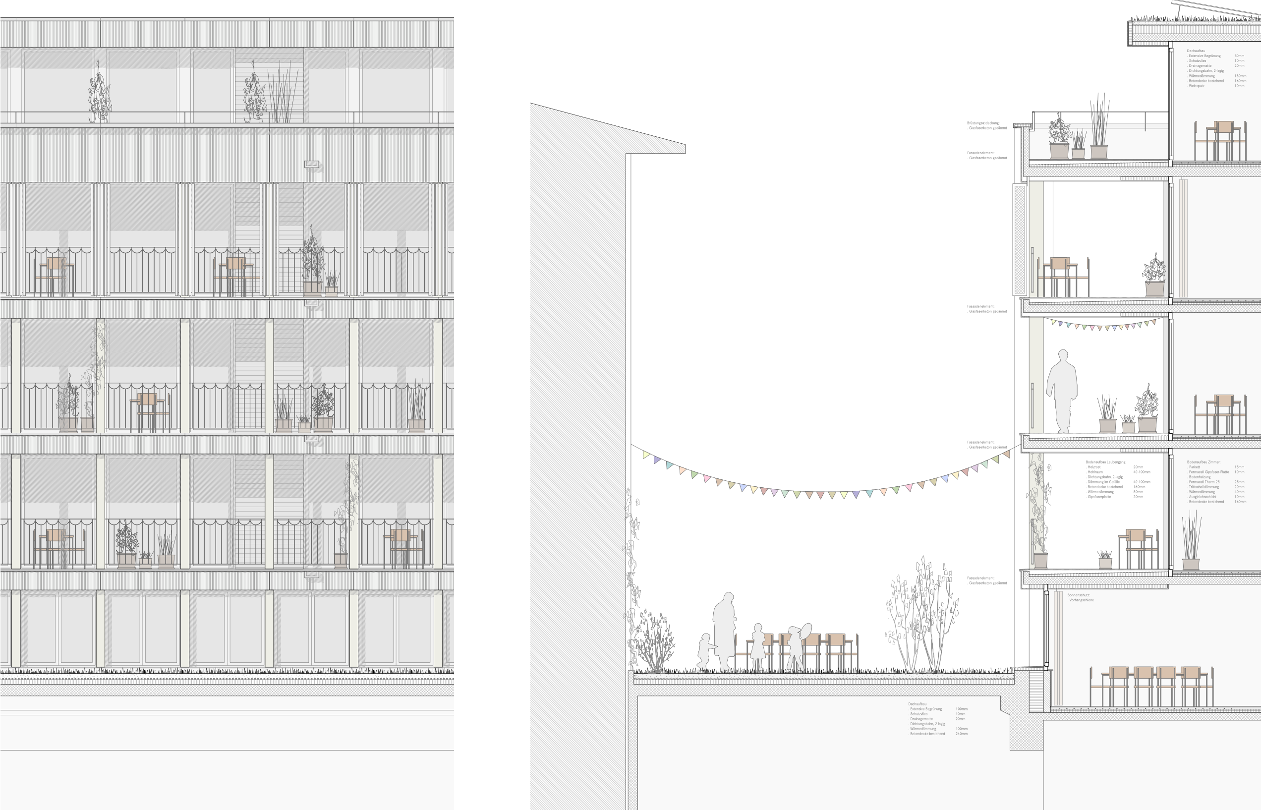 Eine präzise Erschliessungsfigur gliedert die unterschiedlichen Nutzungen im Haus und schafft verschiedene Privatheitsgrade: Ein prägnanter Treppenaufgang führt in die grosszügige Eingangshalle, welche sämtliche Nutzungen erschliesst und eine Querverbindung vom Strassenraum in den hofseitigen Aussenraum schafft. Der Hof ist das extrovertierte Zentrum und ermöglicht für Begegnungen. Die Laubengänge, welche die Wohnungen erschliessen, werden durch die Bewohner in Beschlag genommen und dienen als privater Aussenraum. Die Essküchen teilen sich jeweils zwei Kleinwohnungen. Die Kleinwohnung selbst ist schliesslich der individuelle private Rückzugsort des Einzelnen. Die Grundrisstypologie ist durch flexible Trennwände modular aufgebaut: Eins 2 oder 3 und ermöglicht damit verschiedene Nutzungsszenarien.